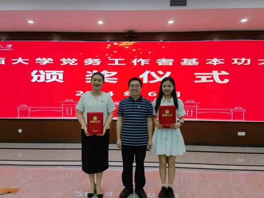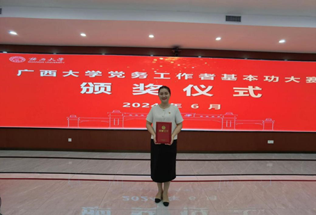 6月21-22日,2024年广西大学党务工作者基本功大赛顺利举办。我院广告学本科生党支部书记刘梦娟与专硕班第一党支部书记黄雅琦参加学生党支部书记组赛道,经过比拼,刘梦娟老师荣获一等奖,黄雅琦荣获二等奖!