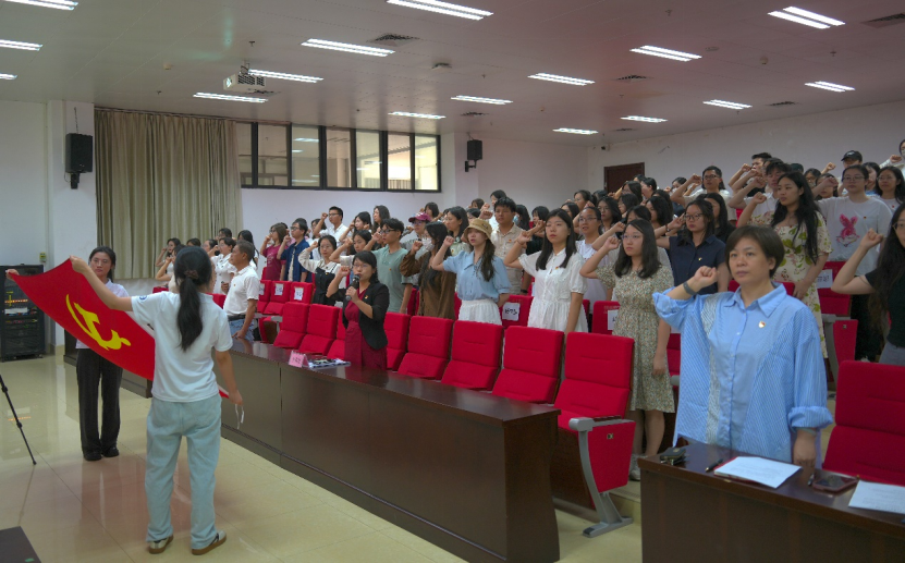 大会最后,全体毕业生党员重温入党誓词。在鲜红的党旗下,党员们高举右拳,庄严宣誓。洪亮的誓言表达了他们对党的忠诚和对未来的坚定信念。