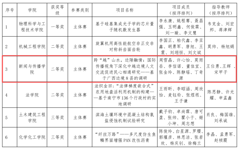 2025年10月31日至11月3日,由共青团中央、中国科学技术协会、教育部、中国社会科学院、中国工程院、全国学联、江苏省人民政府共同主办的第十九届“挑战杯”全国大学生课外学术科技作品竞赛终审决赛在南京大学举办。我院项目《跨“越”山水,边陲融情:国际传播视角下深化中越边境人文交流促进民心相通研究——基于广西边境8县的调研》在主体赛中荣获全国二等奖,实现学院“挑战杯”国赛阶段“零突破”。