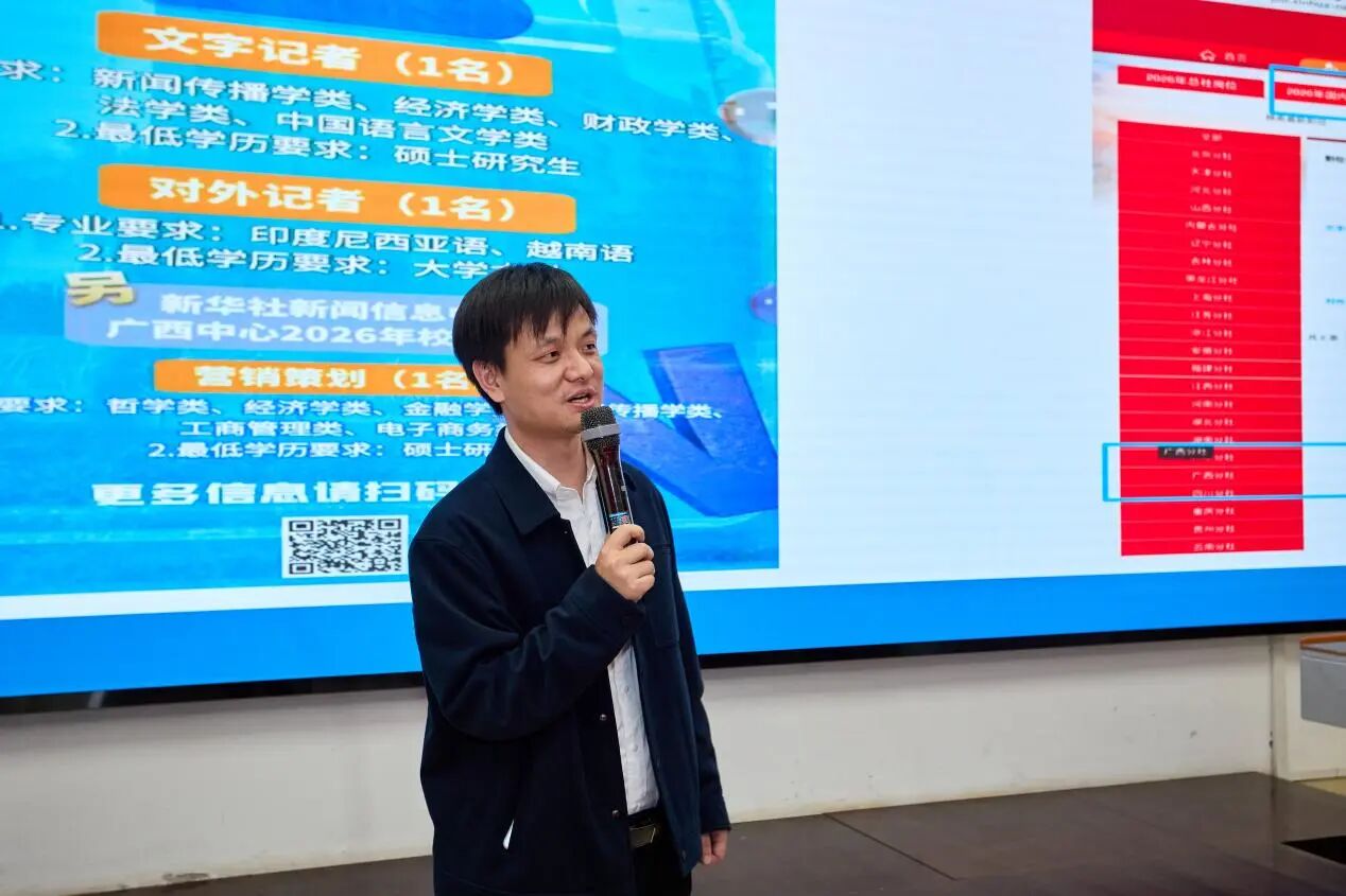 11月28日,“新声无限——2025年新华社进校园”在广西大学新闻与传播学院西报告厅举办。新华社广西分社副社长、分党组成员罗博,广西大学党委常委、副校长于文进出席活动并致辞。