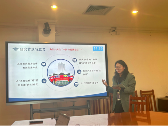 在张剑副教授的指导下,硕士生黄雨馨在平行论坛一中以《面向东盟的国家形象建构:基于东博会报道的批判话语分析》为题作报告。研究立足中国与东盟深度经贸合作背景,选取人民网英文版2024年中国-东盟博览会相关报道为研究对象,采用费尔克劳夫三重批判话语分析框架展开探究。研究发现,东博会作为向东盟传递中国叙事的重要载体,其相关报道在文本层面构建了以合作为核心的叙事框架,将广西塑造为国家开放战略的区域支点,深度融入双碳、科技自立自强等国家发展战略,通过多元权威信源增强传播公信力,立体呈现中国作为区域经济推动者、技术引领者和绿色发展伙伴的形象。研究指出主流媒体可通过丰富信源、小切口叙事与未来议题拓展等形式,推动国家形象建构成为自我陈述与他者认同相契合的共情工程。