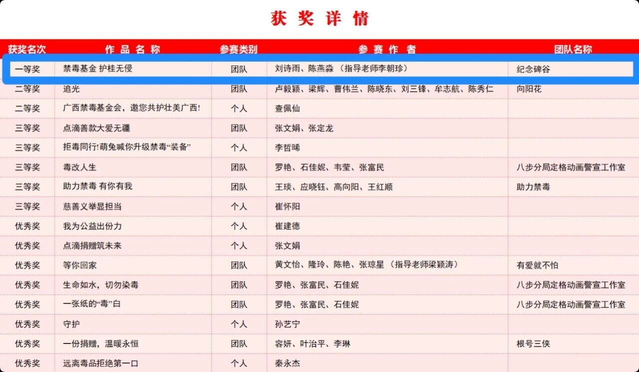 2月6日,广西禁毒基金会主办的禁毒宣传微视频征集活动评选结果揭晓,我院2025级专硕班刘诗雨、2024级专硕班陈燕淼合作创作的作品《禁毒基金 护桂无侵》从132部作品中脱颖而出,荣获一等奖。