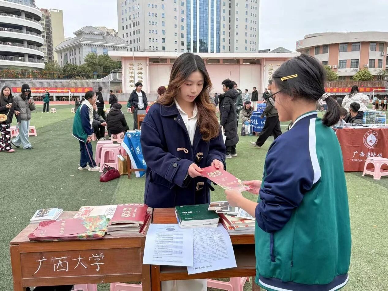 课间的喧闹、放学的人流,摊位前始终人气满满。从西大的学术氛围、特色专业,到校园里的四季风光、青春趣事,两位同学耐心解答每一个疑问,细致分享自身求学经历,把西大的活力与温暖,一点点铺陈在母校的蓝天下,让每一位前来咨询的学弟学妹,都能近距离感受西大的魅力。