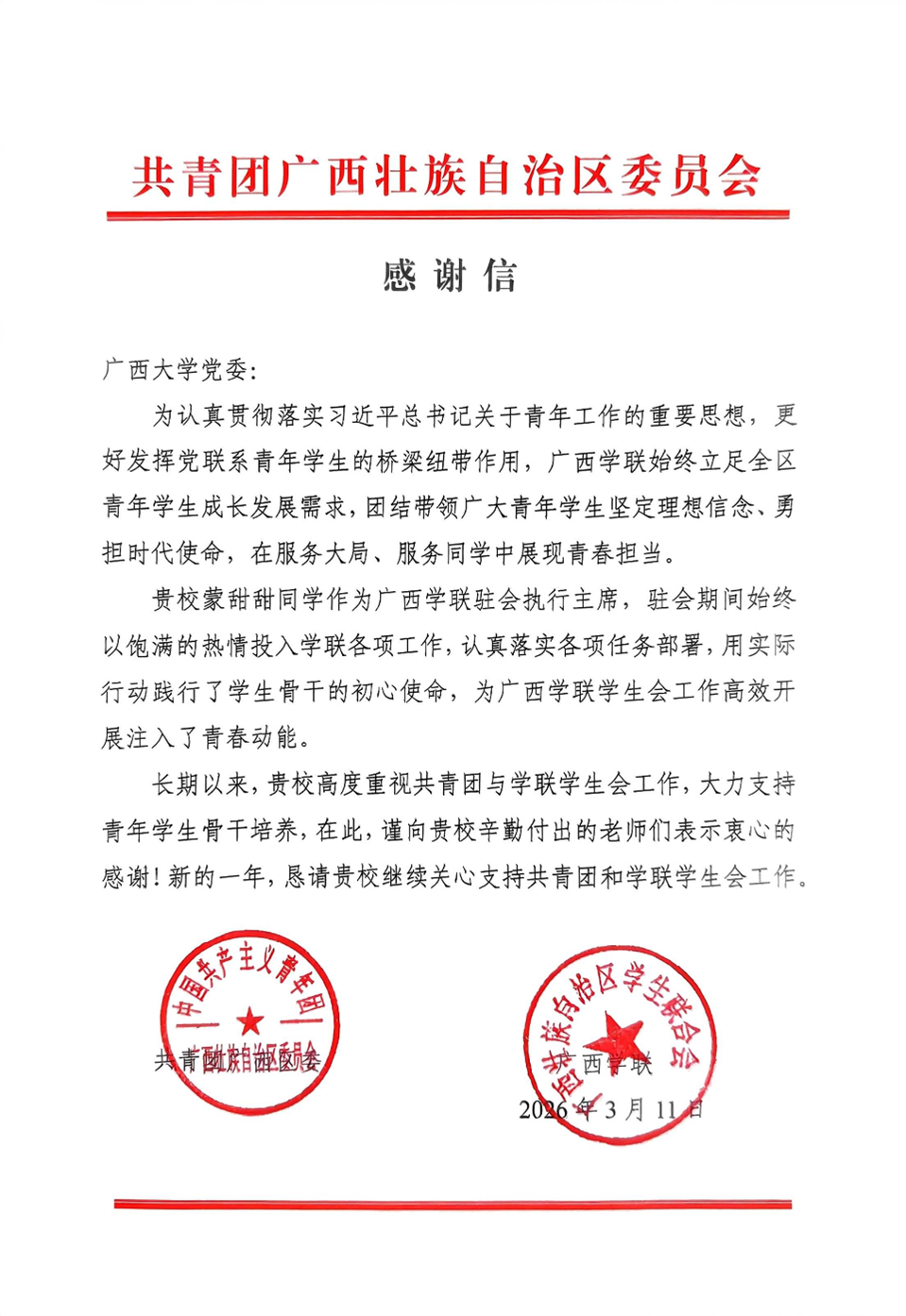 近日,共青团广西壮族自治区委员会向广西大学党委发来感谢信,对我校大力支持共青团与学联学生会工作、用心培养青年学生骨干表示衷心感谢,特别表扬了我院24级新闻传播学硕士研究生蒙甜甜同学在广西学联驻会期间的优异表现。
