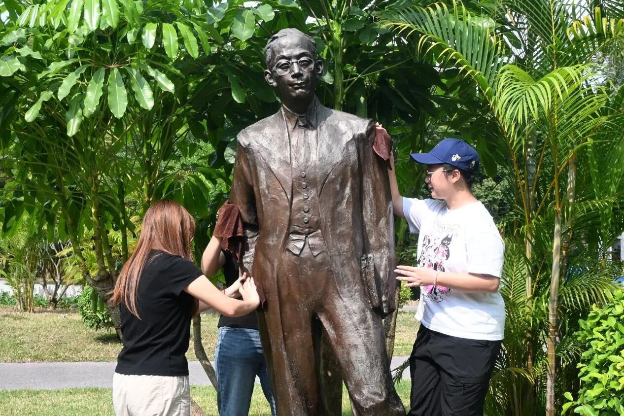 下午15时,师生们手持清洁工具,分组对育才广场的25尊名人雕像进行细致清洗。从底座到雕像轮廓,同学们认真擦拭每一处细节,让名人雕像在春日暖阳下焕然一新。劳动过程中,大家不仅用实际行动践行“奉献、友爱、互助、进步”的志愿精神,更在与先贤的“无声对话”中感悟榜样力量。