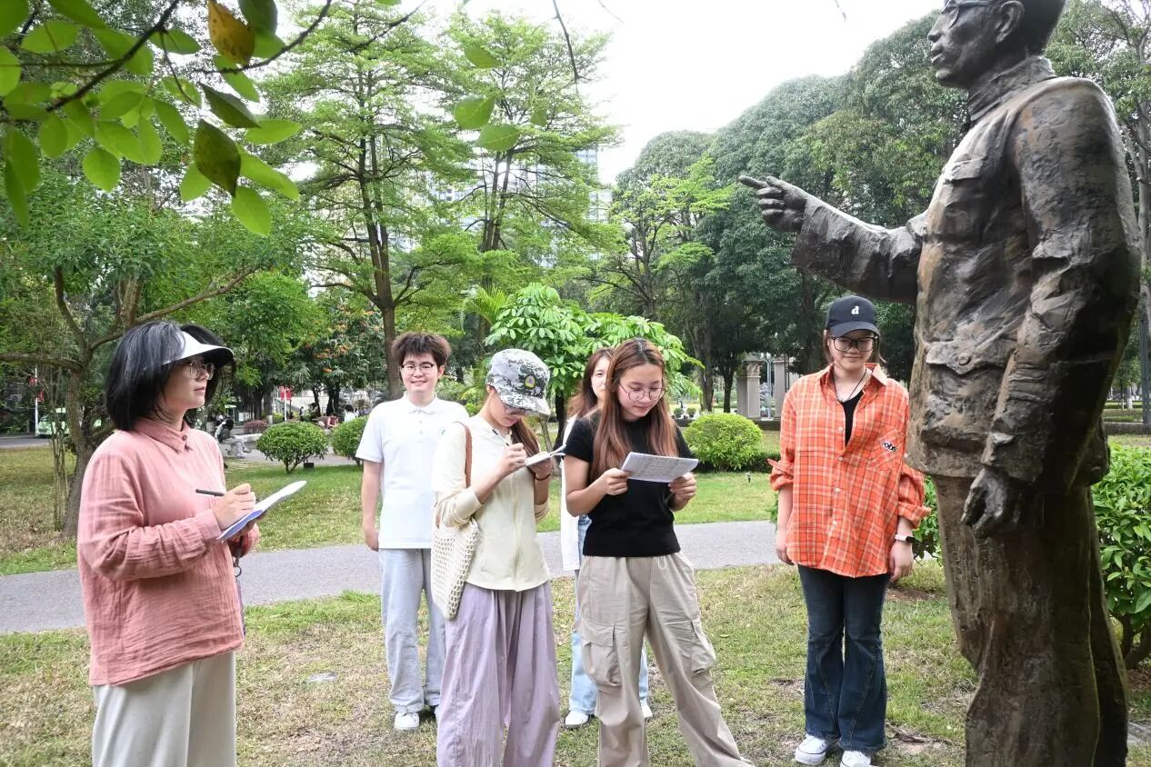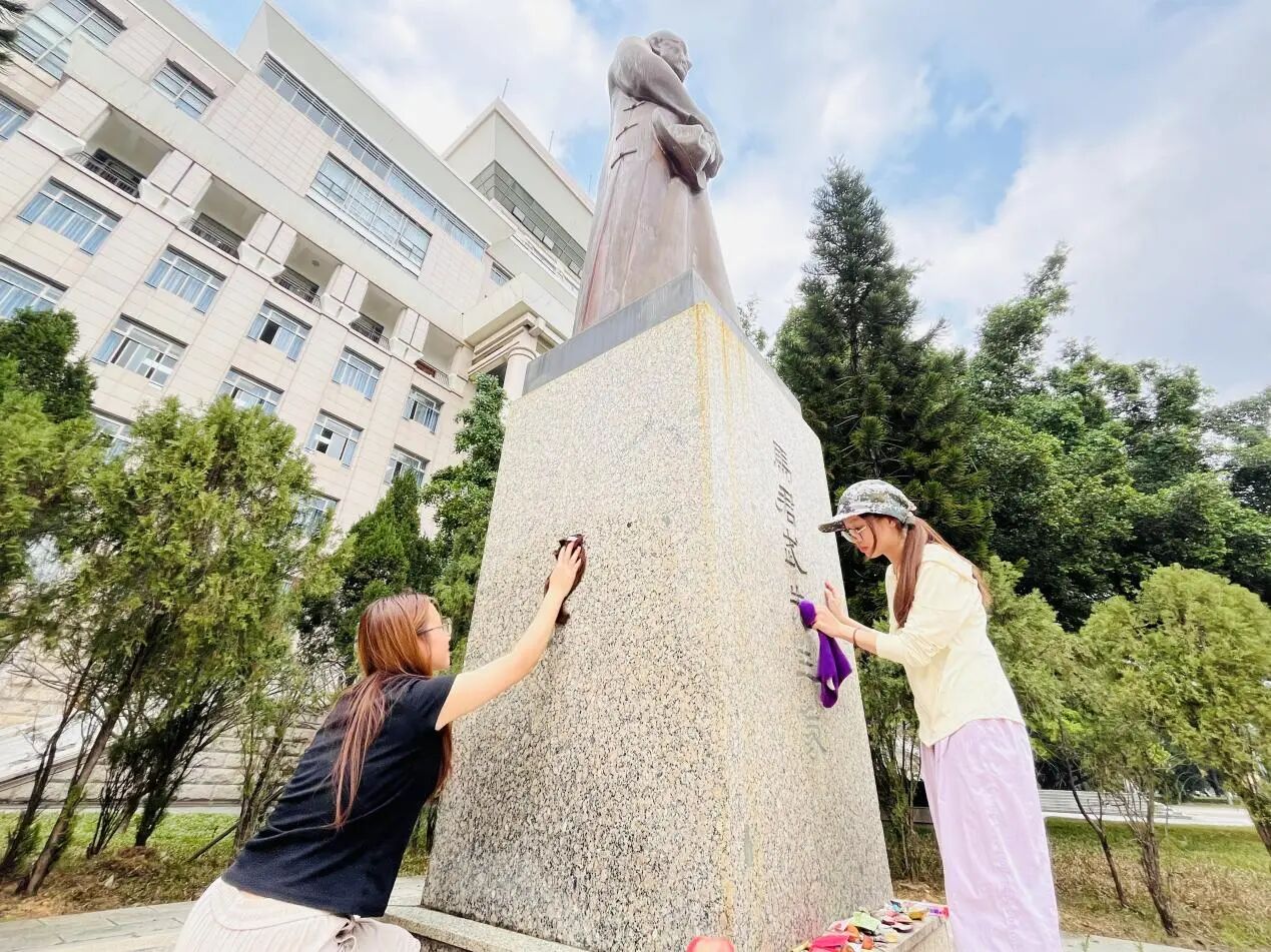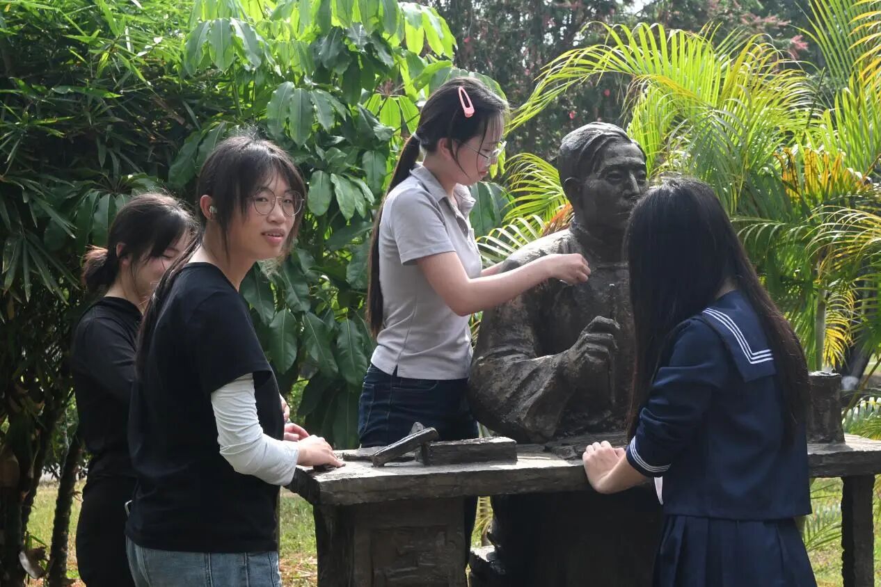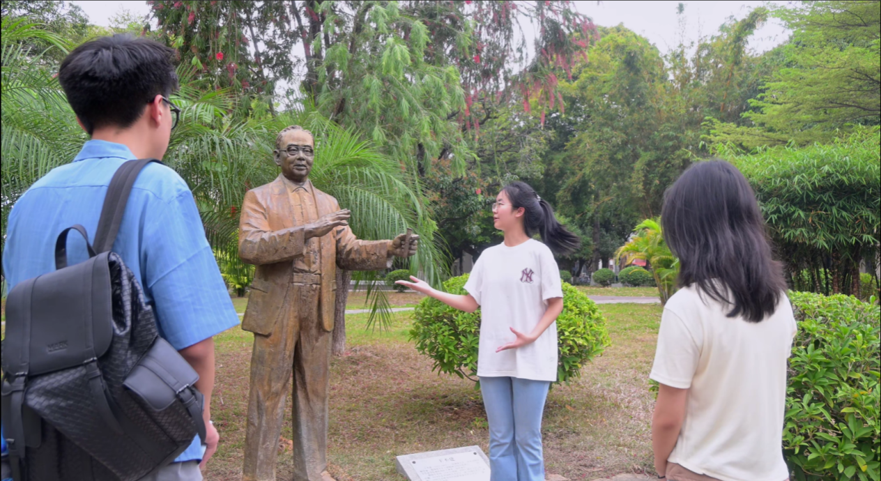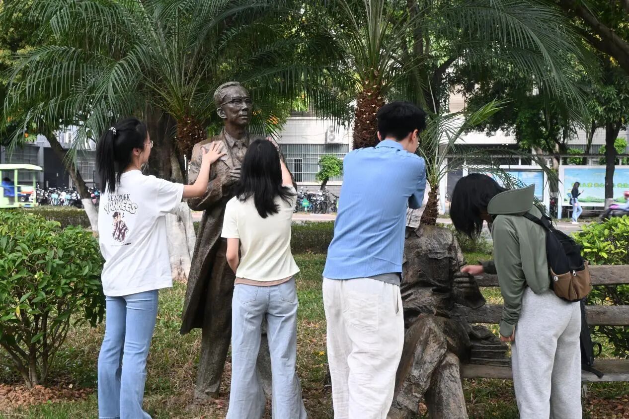 劳动环节结束后,活动进入“认识一名西大名人”“了解一段西大历史”“共唱一首西大校歌”环节。在学院团委书记何湘桂的带领下,师生们驻足于马君武、白鹏飞等西大先贤雕像前,聆听他们为学校发展和教育事业奋斗的生平事迹。随后,师生共同唱响广西大学校歌,“复兴中华,发达广西”的激昂旋律在育才广场回荡,进一步增强了师生们的归属感与使命感。