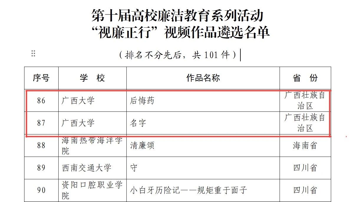 近日,教育部办公厅公布第十届高校廉洁教育系列活动评选结果,广西大学共有5项作品成功入选。其中,我院黄海珠副教授参与创作,播音与主持艺术专业221班丁磊、凌凯文,播音与主持艺术专业231班杨淼参演的2项作品《后悔药》《名字》榜上有名。