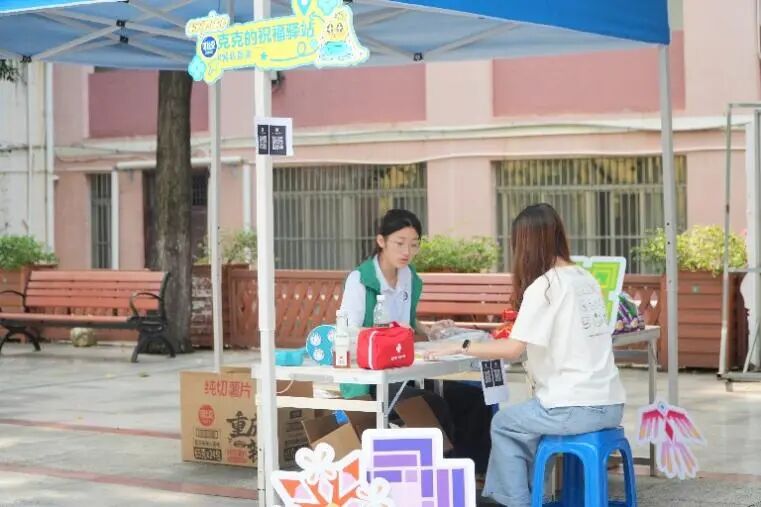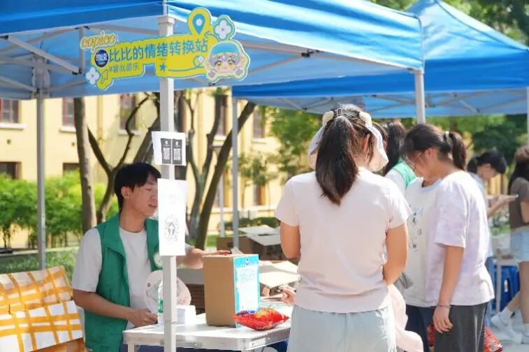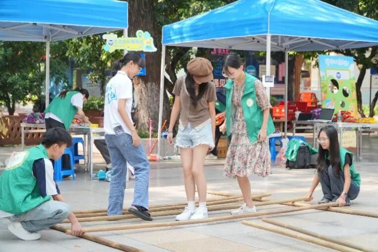 在现场互动环节,团队策划了四个活动板块,分别是“可可的土豆乐园”、“比比的情绪转换站”、“克克的祝福驿站”、非遗竹竿舞挑战,并成功与学校“心理健康成长团”达成合作。现场同学们踊跃参与,在“可可的土豆乐园”畅玩沙包游戏,在“情绪交换箱”用明信片记录此刻的感受,在“祝福驿站”静下心来用“拼豆豆”一点一点勾勒出自己喜爱的角色,在富有节奏的竹竿开合间,同学们不仅体验了广西本土文化的魅力,更在协作与欢笑中增强了连接感,将现场快乐氛围推向高潮。