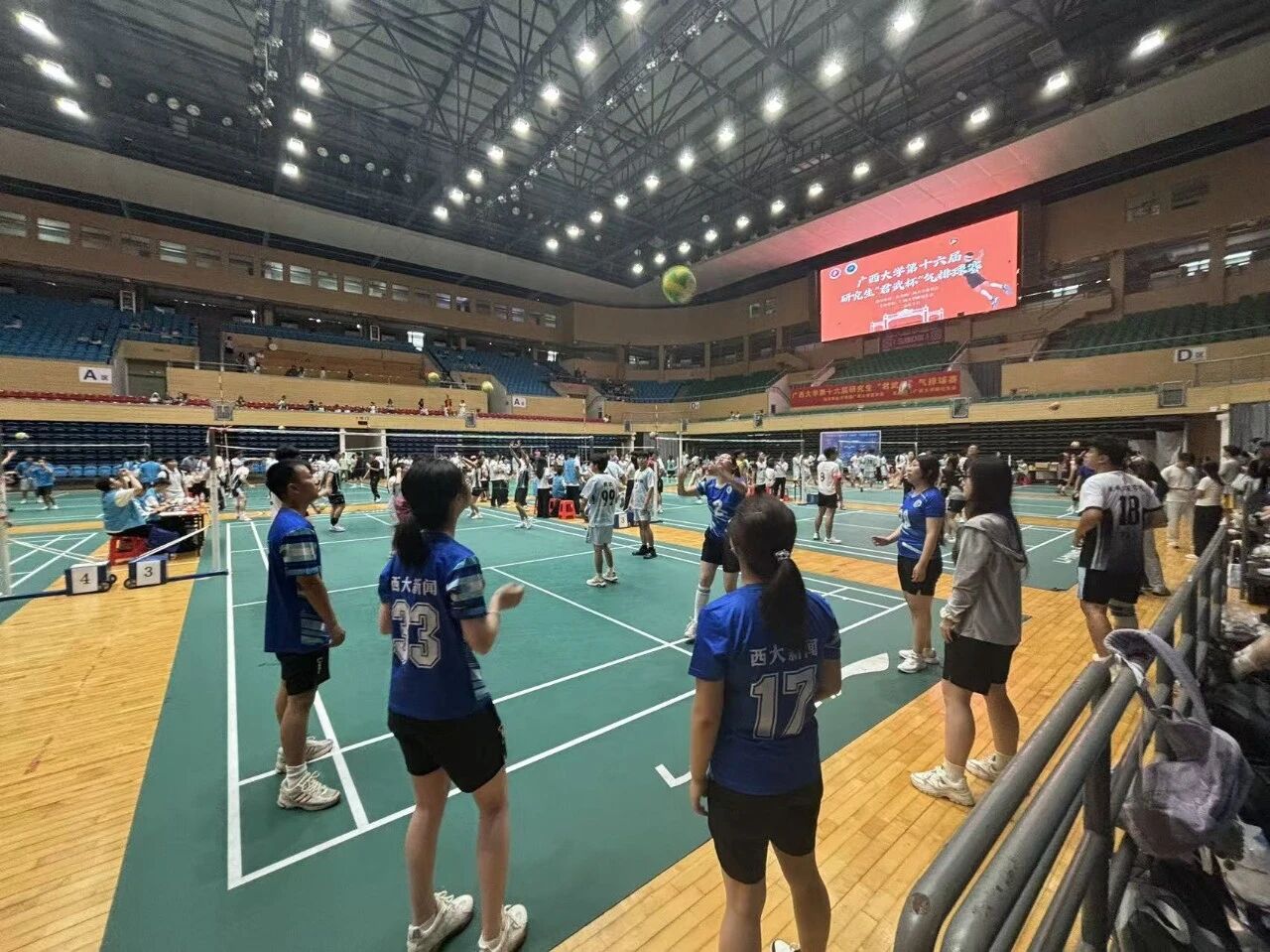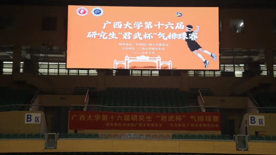 秋日暖阳,点燃拼搏热血;赛场汗雨,共筑青春梦想。10月18日上午,广西大学第十六届研究生“君武杯”气排球赛在广西大学西校园体育馆正式开幕。校团委书记雷圆媛、副书记朱茂程,以及陈晓江、秦凤微、李易明等老师出席开幕式,来自24个学院及校级学生组织功能型党支部的25支参赛队伍齐聚现场。