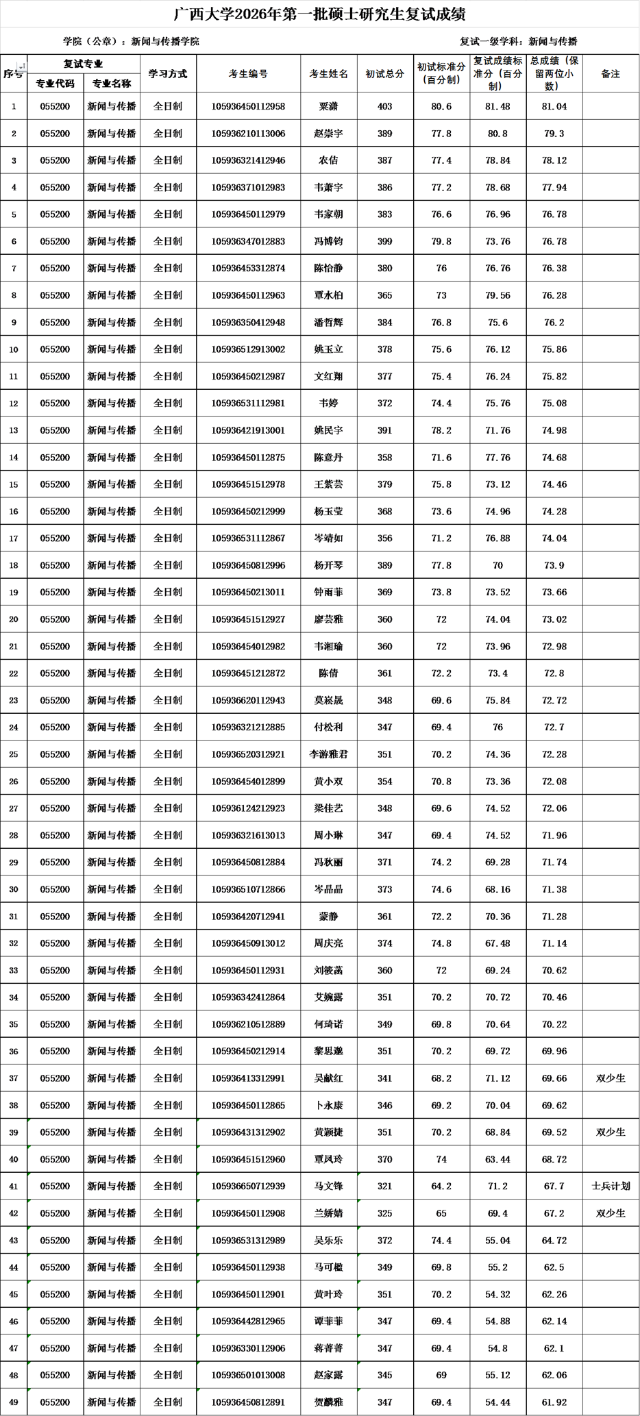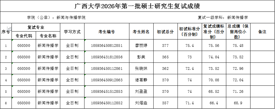 广西大学新闻与传播学院2026年新闻传播学、新闻与传播一志愿考生复试成绩如下,如有异议,请联系新闻与传播学院研究生办公室反映,联系电话:0771-3229833。